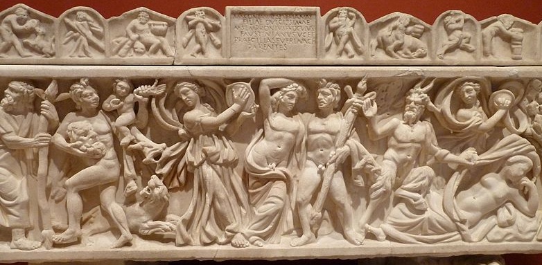 Weddings of Dionysos and Ariadne. The Latin inscription identifies the girl for whom this sarcophagus was made as Maconiana Severiana, member of a wealthy senatorial family. Ariadne’s face was probably left unfinished to be completed as a portrait of Maconiana. The lion supports were added sometime after the discovery of the sarcophagus in Rome in 1873. Roman marble sarcophagus, 210–220.